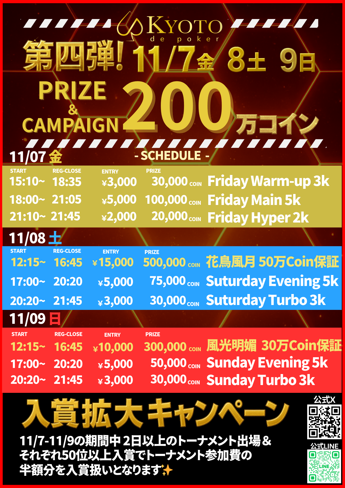 11/7-11/9期間中、2日以上のトーナメント出場&それぞれ50位以上入賞でトーナメント参加費の半額分を入賞扱いとします‼