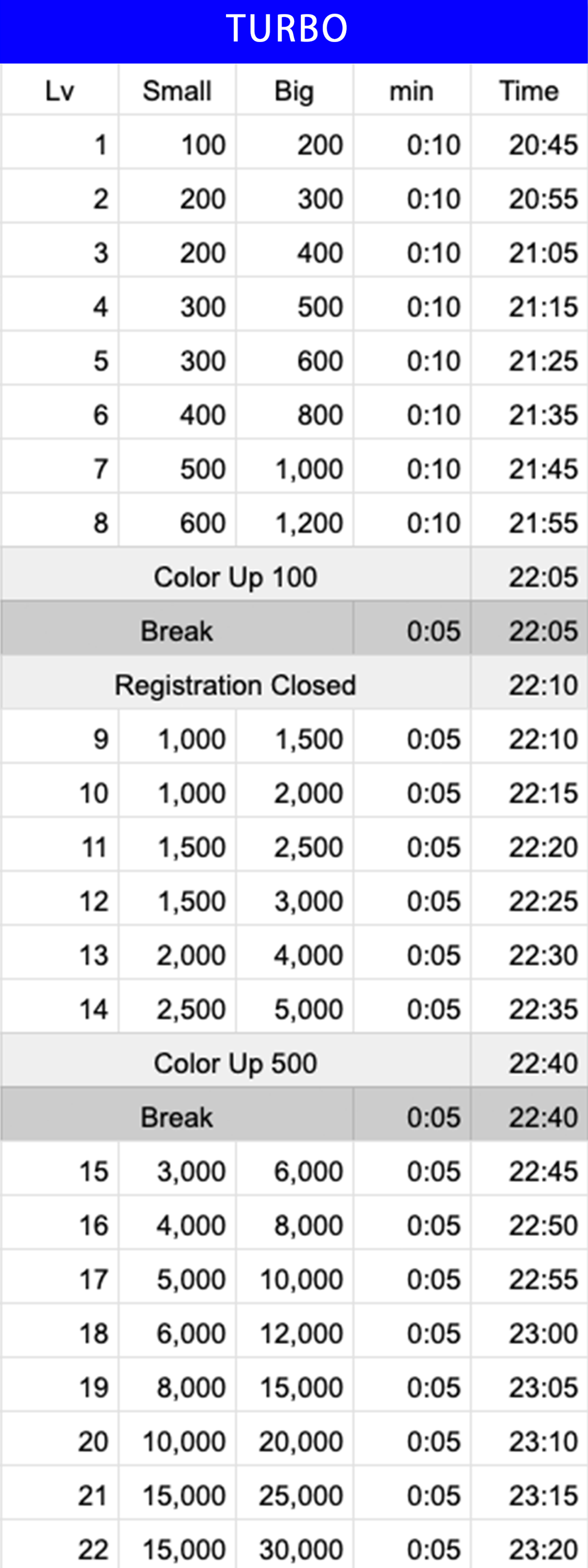| ゲーム | 20,000点 / ノーリミット / テキサスホールデム / 15Min. / ポイントなし |