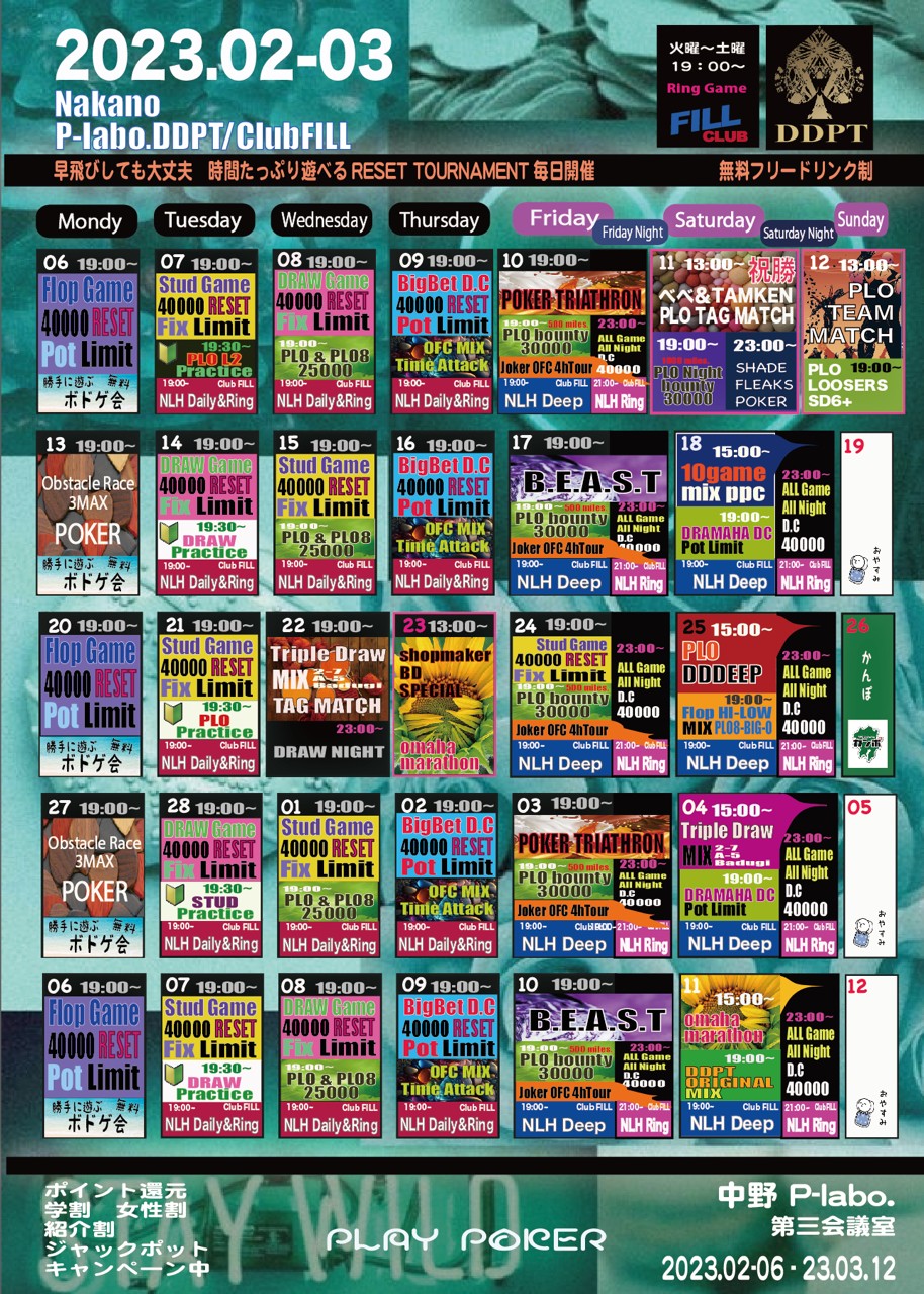 中野P-labo.にて19時からPLO (ポットリミットオマハ)のトーナメントを開催します。