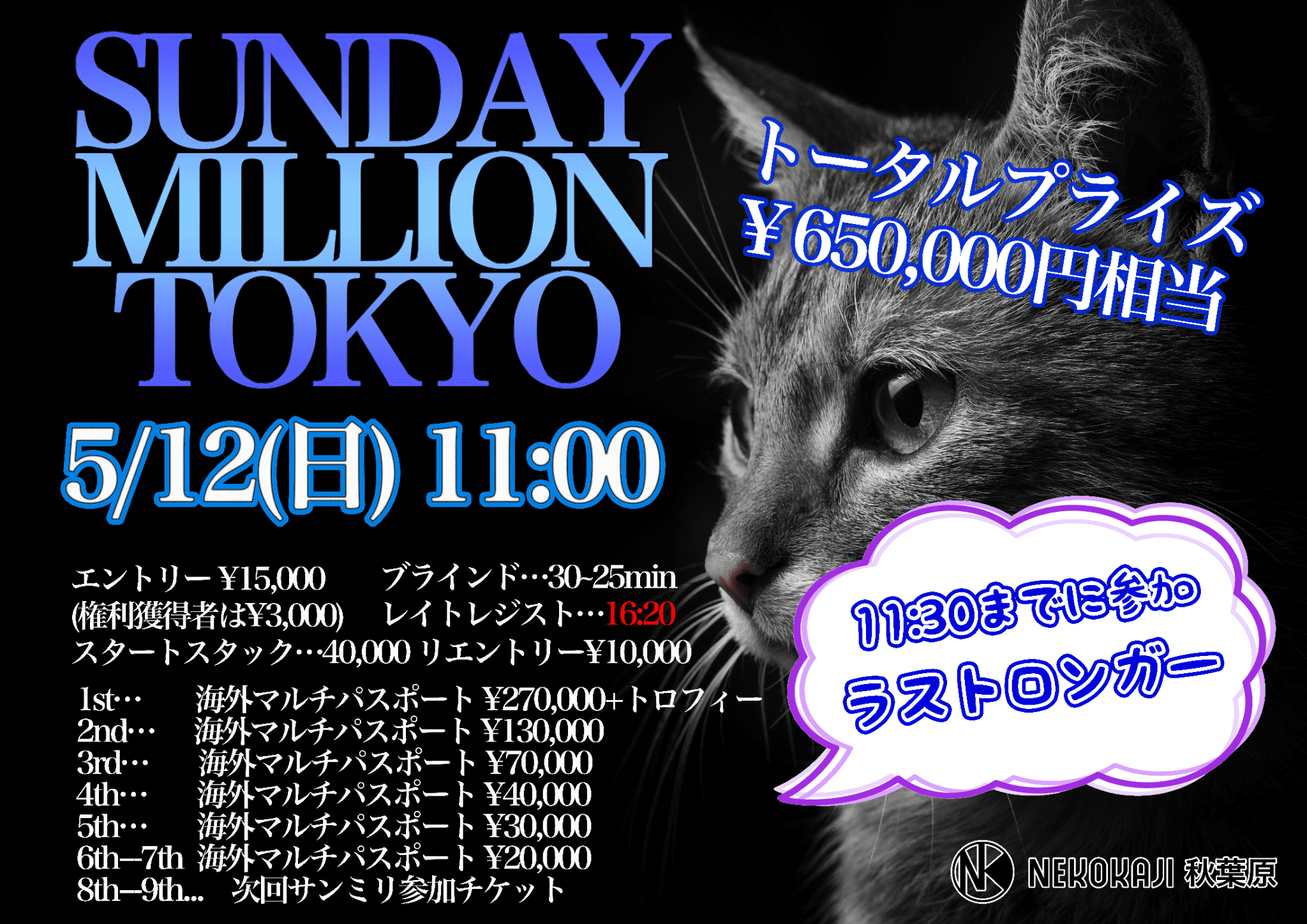 1R終了時までに(11:30)着席された方の中で、最後まで残ったプレイヤー上位5名の方には、ラストロンガー限定の抽選が受けられます。抽選では、サンミリチケットや店内で使えるマルチチケットなどが当たります!!