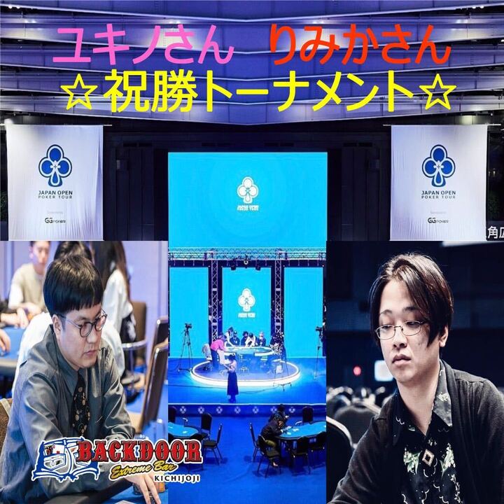 ユキノさん・りみかさん祝勝トーナメント!!みんなでお二人の勝利をお祝いしよう♪トーナメント入賞者にはお食事券を進呈!ユキノさん・りみかさんはバウンティ賞を持って参戦します♪しかもトーナメントでチップを持っている間は飲み放題!!是非皆様ご参加ください♪