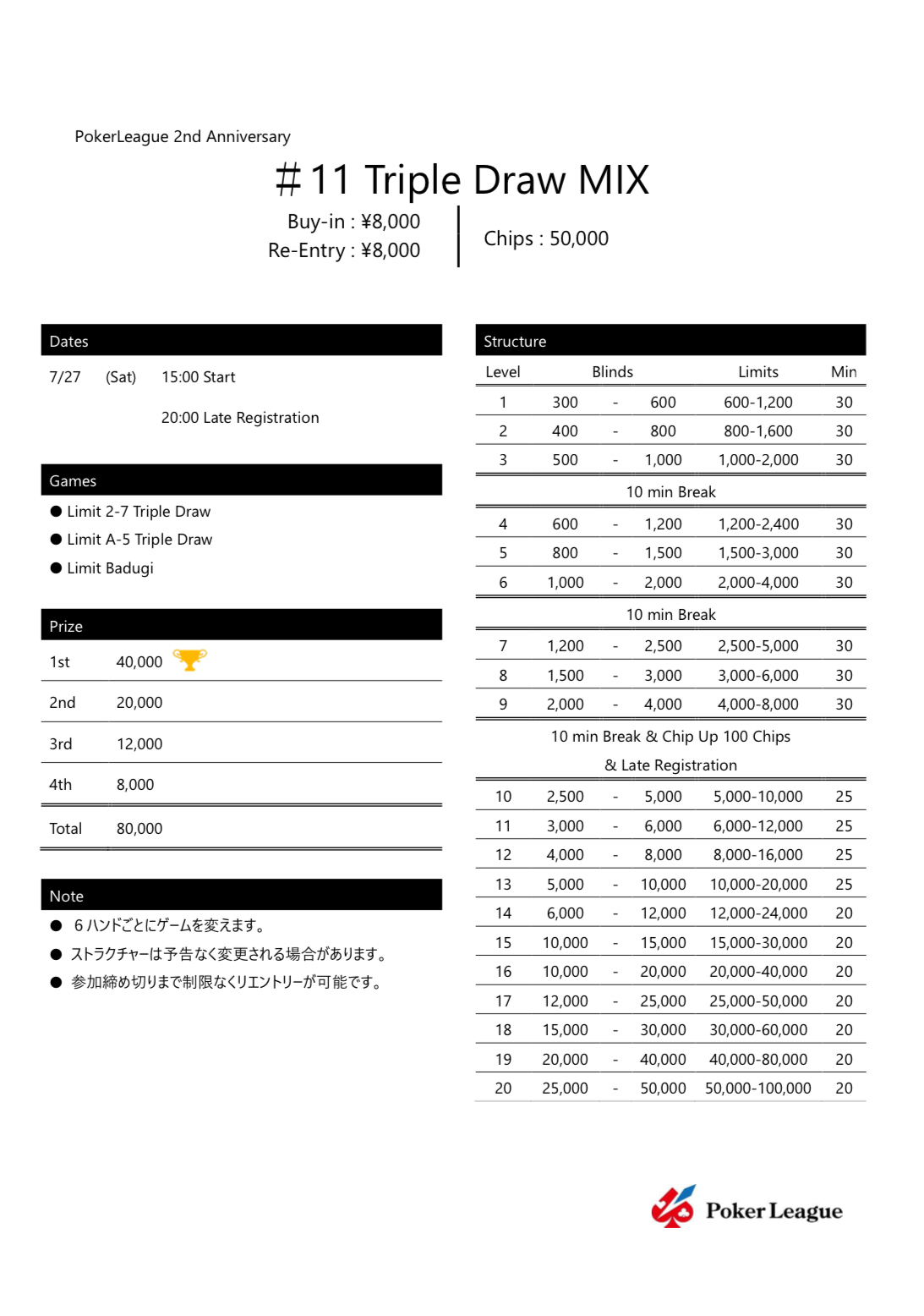 PokerLeague 2nd Anniversary 【#11 Triple Draw MIX】