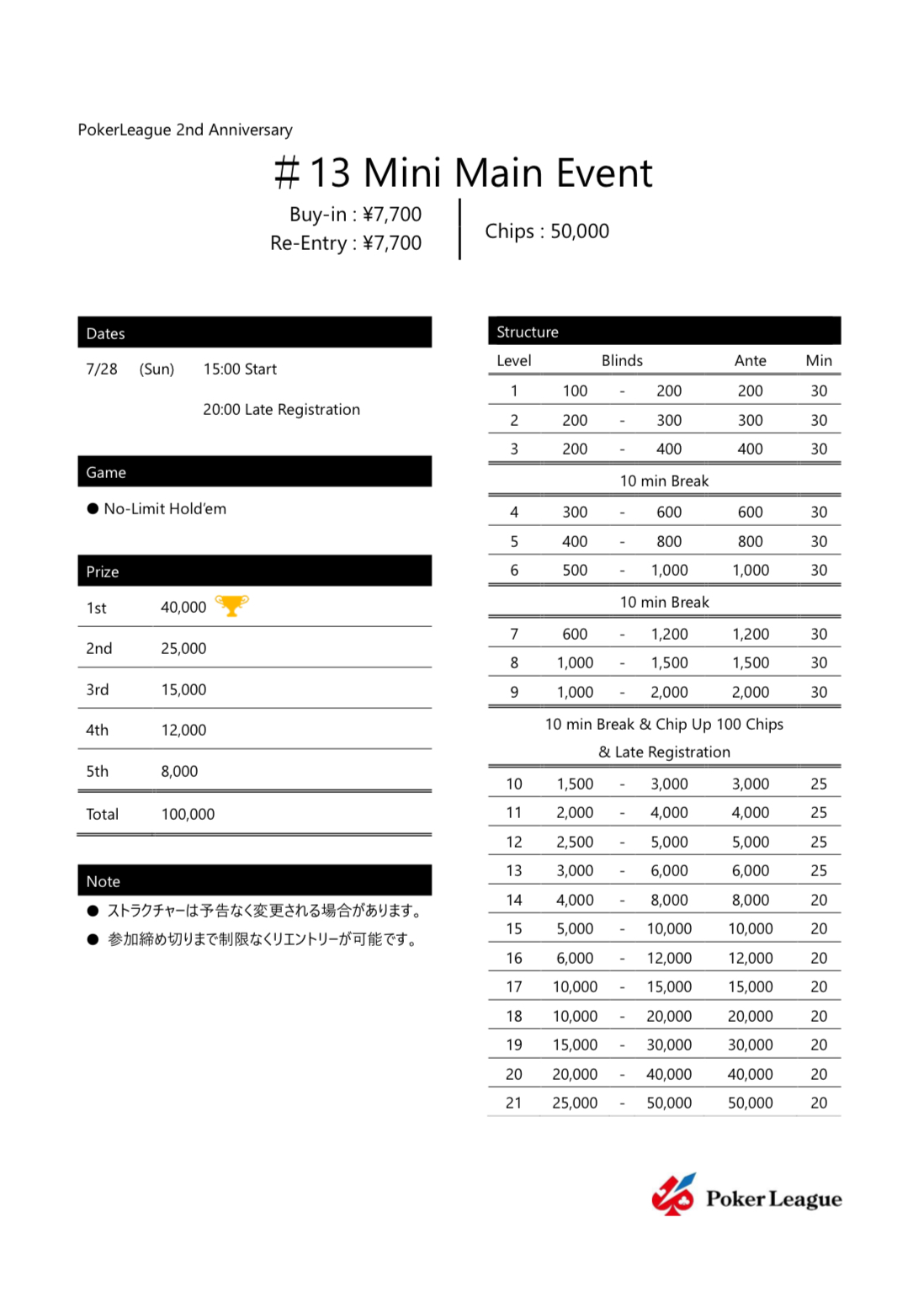 PokerLeague 2nd Anniversary 【#13 Mini Main Event】