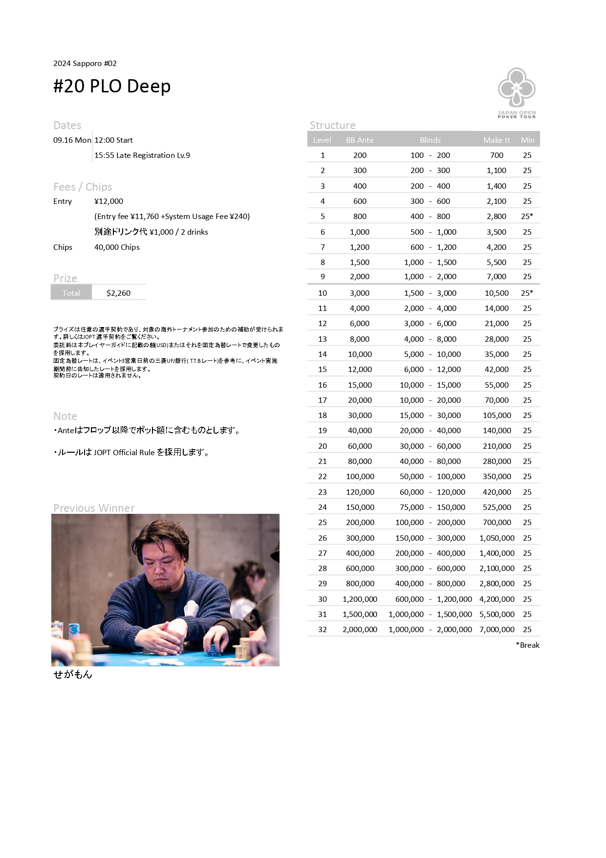 | 公式ページ | https://japanopenpoker.com/wp-content/uploads/2024/08/24Sapporo02_20PLODeep.pdf |