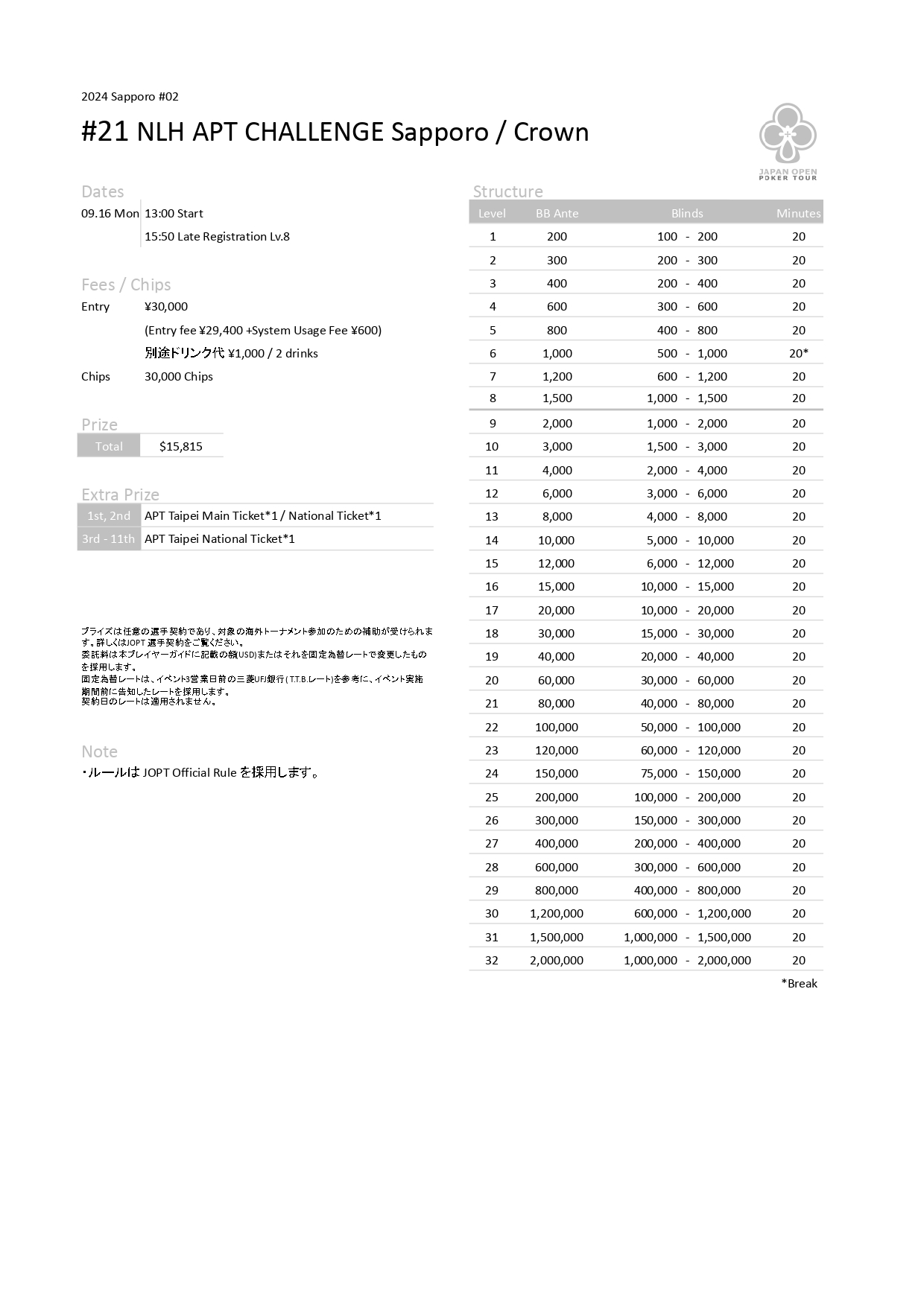 | 公式ページ | https://japanopenpoker.com/wp-content/uploads/2024/08/24Sapporo02_21APT.pdf |