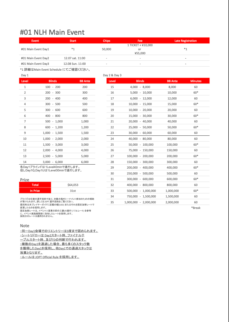 Start 12:00 Reg-end 16:50 Entry : 11,000 JPY + 1 Ticket / 55,000 JPY Re-Entry : 11,000 JPY + 1 Ticket / 55,000 JPY