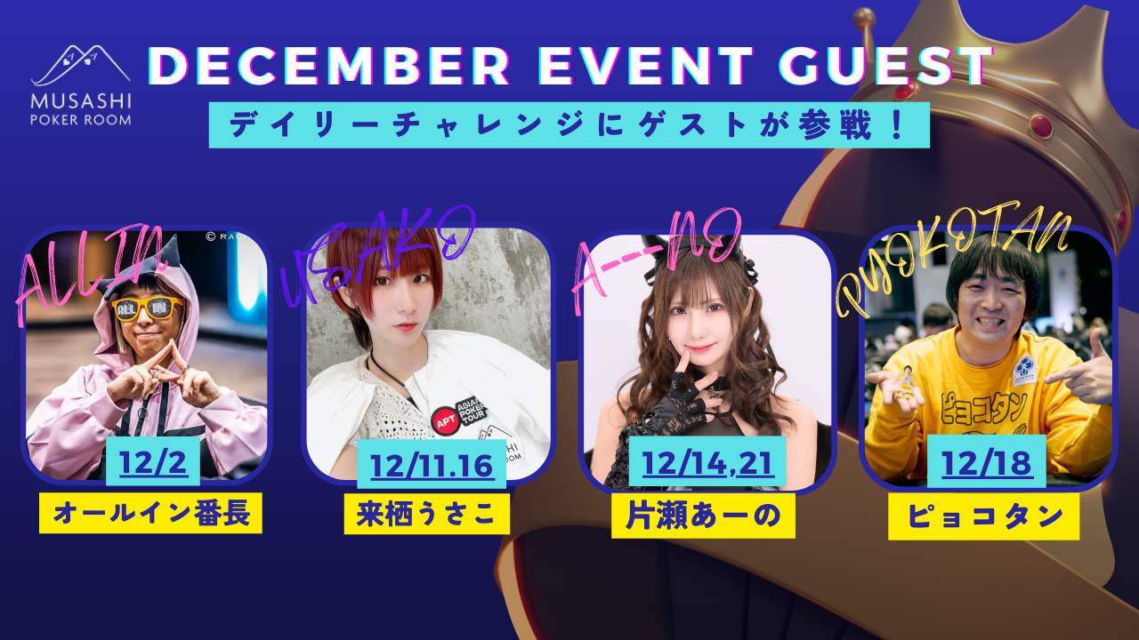 | 12/16(火) | 15:30 | 【♠︎SPADIE】Daily NLH 2K | 秋葉原カジノクエスト |