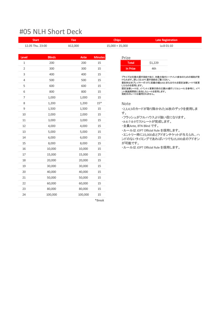 | 12/15(月) | 18:00 | 【JOPT 15Ticket】メガサテライト | Casino Live Tokyo |