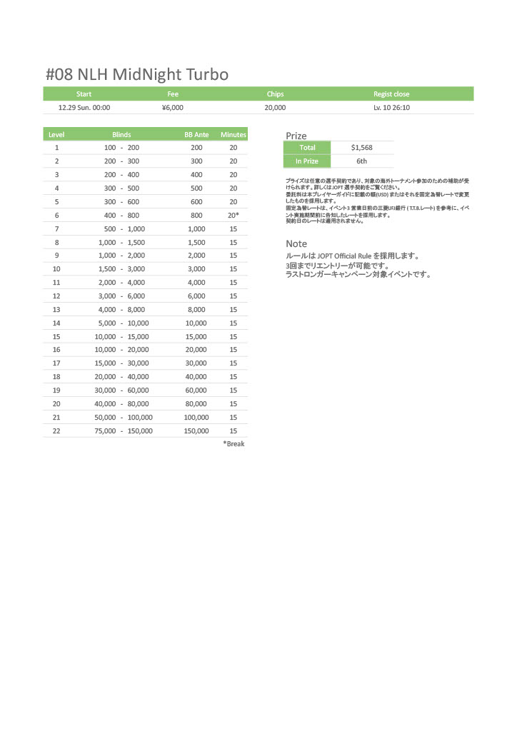 | 12/15(月) | 18:00 | 【JOPT 15Ticket】メガサテライト | Casino Live Tokyo |