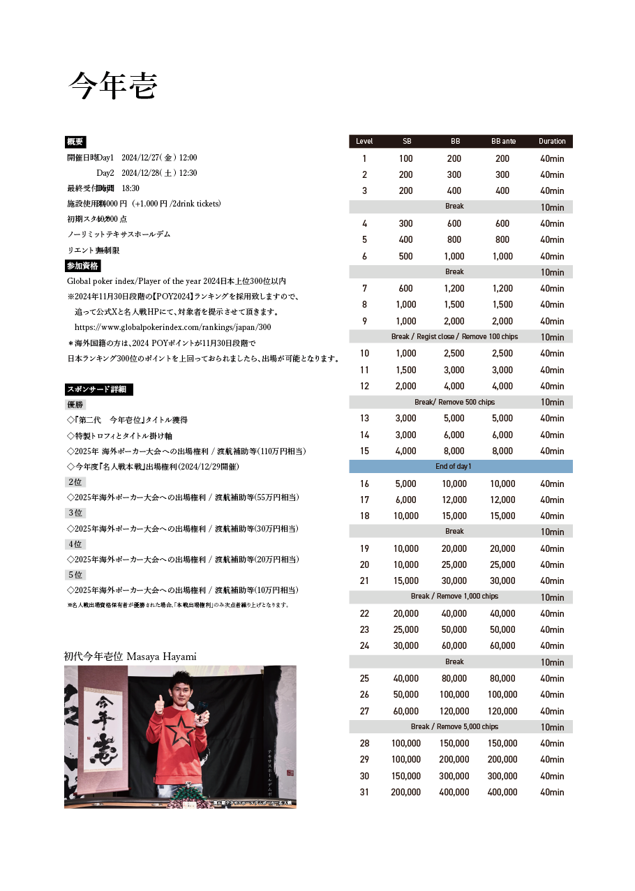 | ゲーム | 40,000点 / ノーリミット / テキサスホールデム / Long / Point |