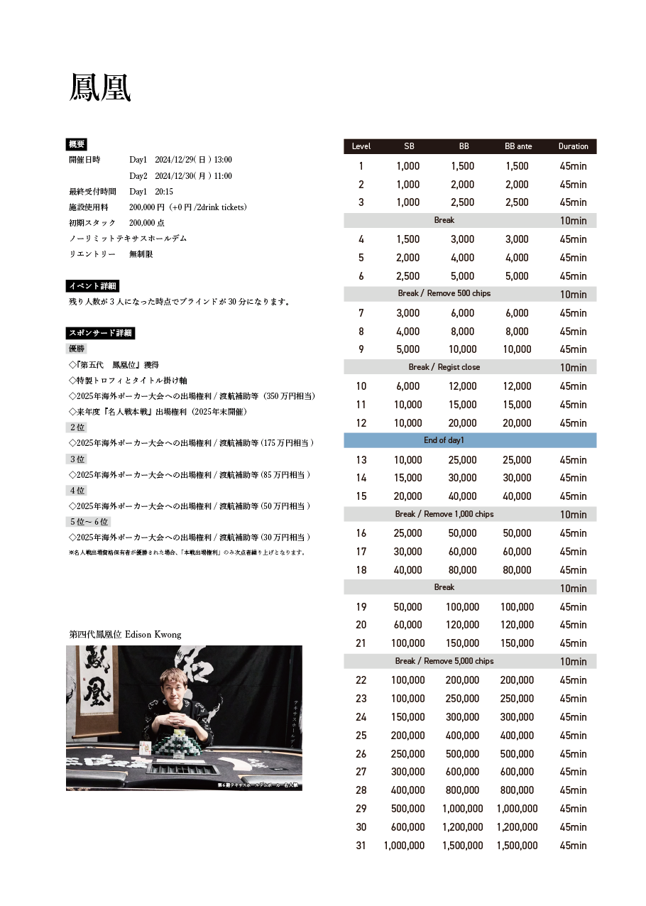 | 12/15(月) | 18:00 | 【JOPT 15Ticket】メガサテライト | Casino Live Tokyo |