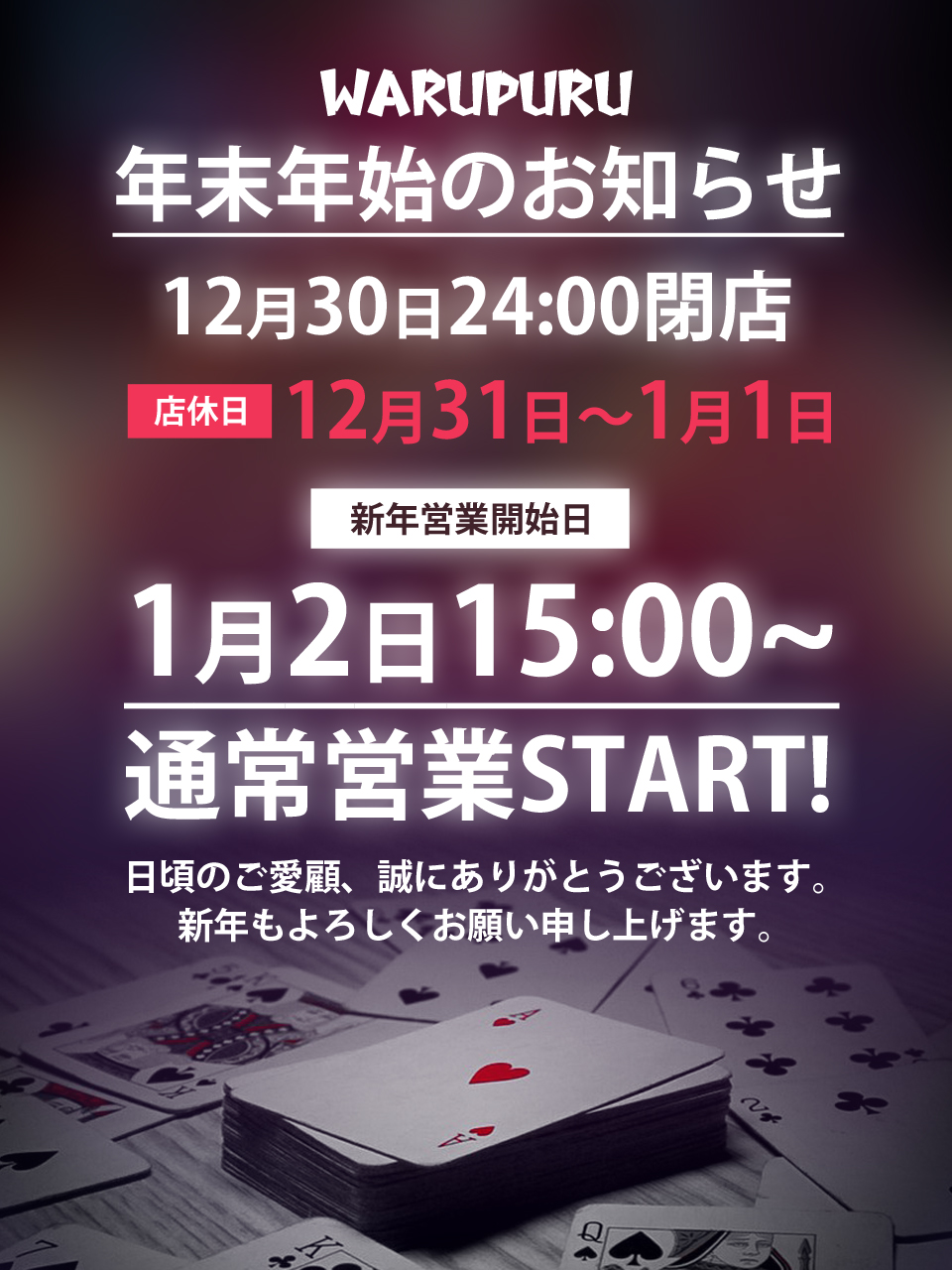新年は1月2日15時から営業させていただきます。
