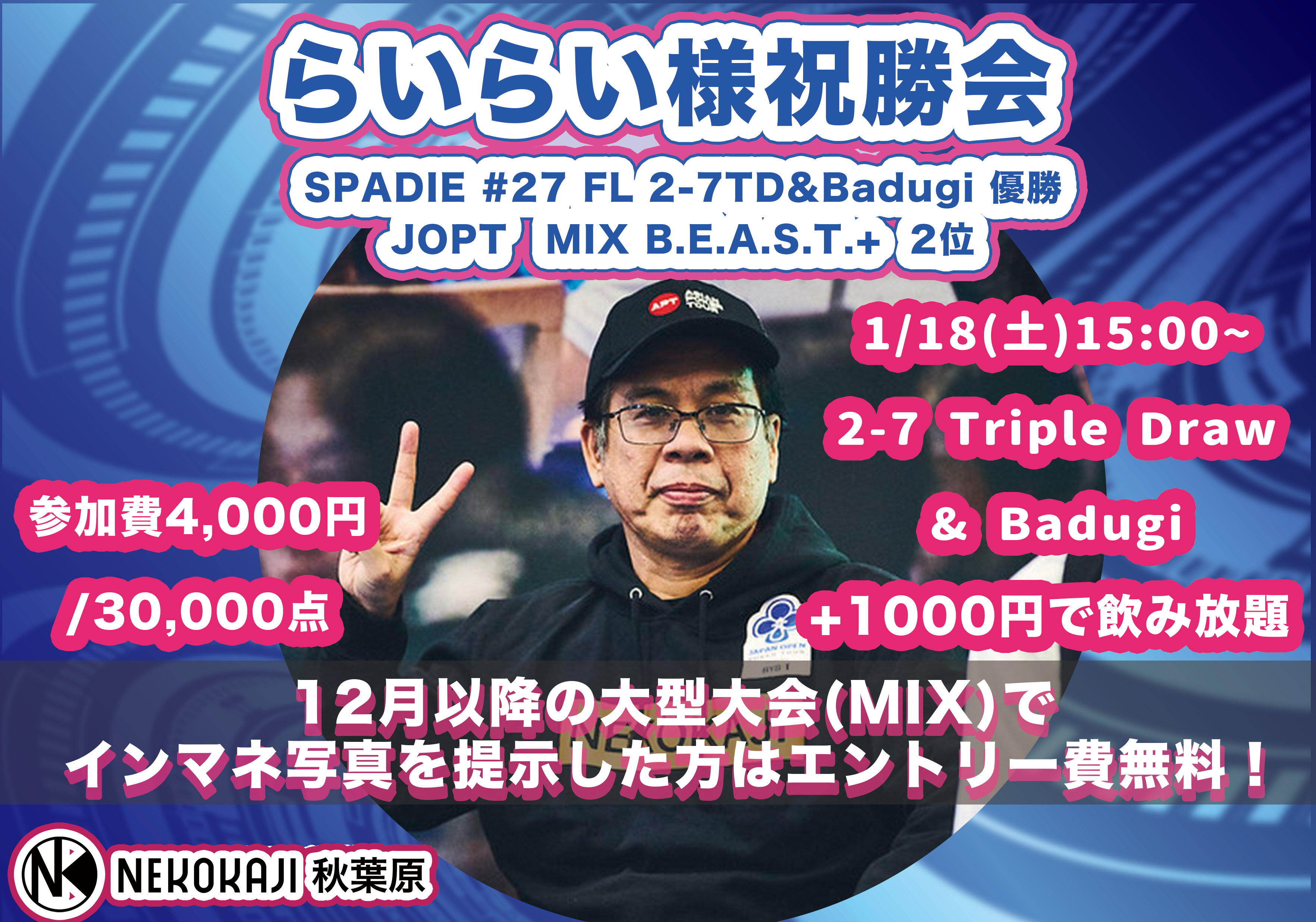 | 12/16(火) | 15:30 | 【♠︎SPADIE】Daily NLH 2K | 秋葉原カジノクエスト |