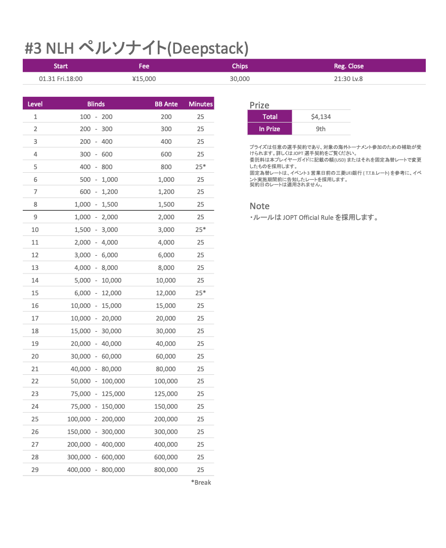 2.プライズで米ドル表記のものは、予め決められた固定為替レートを適用し、変換した日本円と同額のPOKERWEB COINを授与します。実際の選手契約金額は選手契約用紙に記載のものが適用されます(手数料分を含む)。固定為替レートは、イベント3日前の三菱UFJ銀行T.T.B.レート