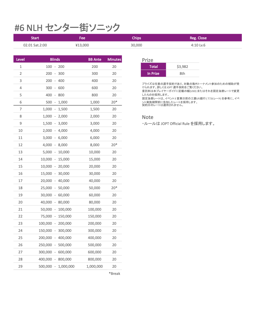 2.プライズで米ドル表記のものは、予め決められた固定為替レートを適用し、変換した日本円と同額のPOKERWEB COINを授与します。実際の選手契約金額は選手契約用紙に記載のものが適用されます(手数料分を含む)。固定為替レートは、イベント3日前の三菱UFJ銀行T.T.B.レート