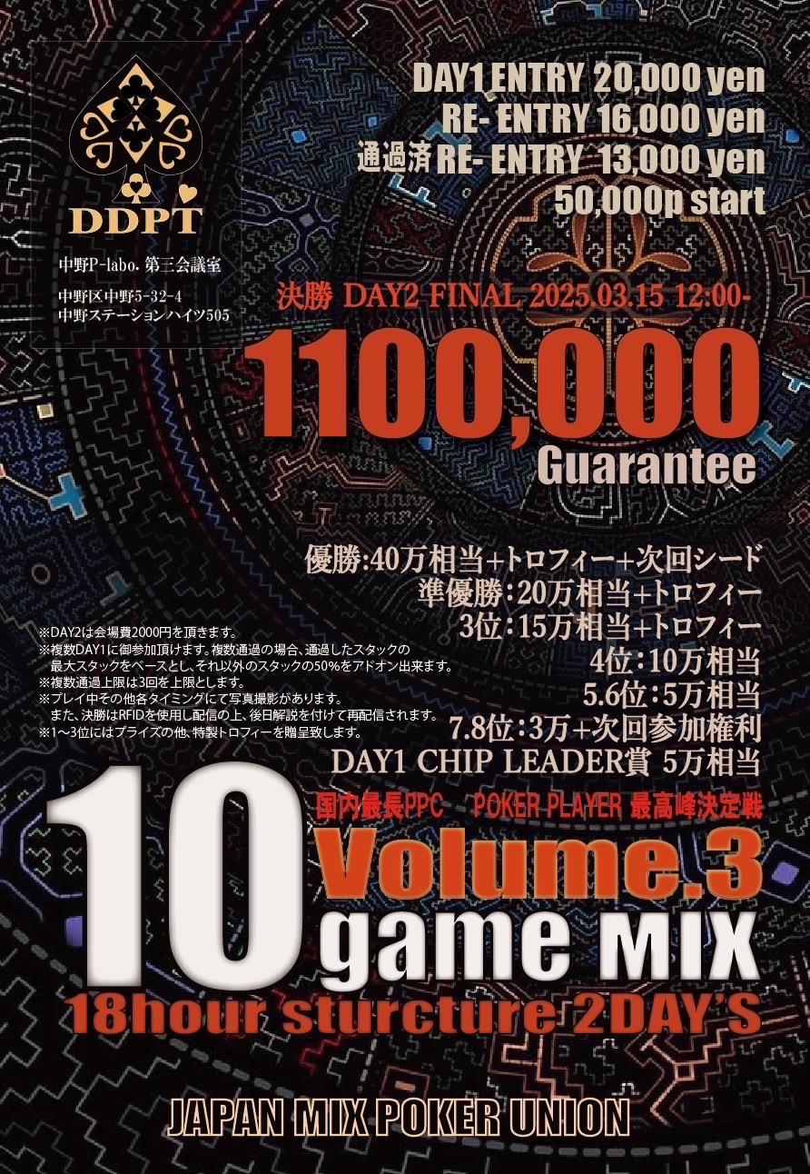 | 12/15(月) | 18:00 | 【JOPT 15Ticket】メガサテライト | Casino Live Tokyo |