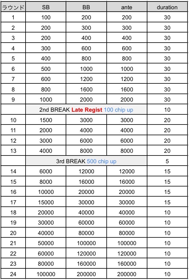 ※TD権限によりタイマースタート、ブラインド、ストラクチャーの変更となる場合がございます。
