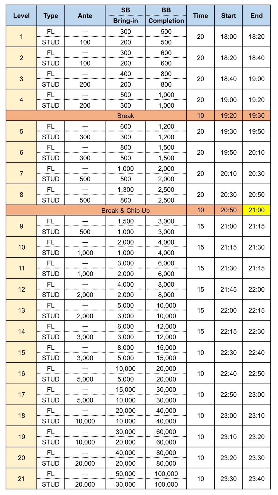 レイト:21時00分(レベル8まで)