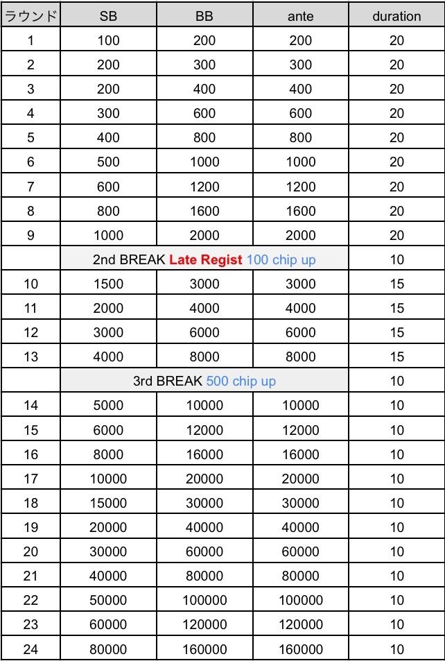 ※TD権限によりタイマースタート、ブラインド、ストラクチャーの変更となる場合がございます。