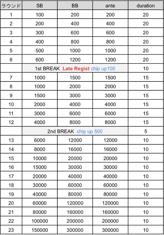 ※TD権限によりタイマースタート、ブラインド、ストラクチャーの変更となる場合がございます。