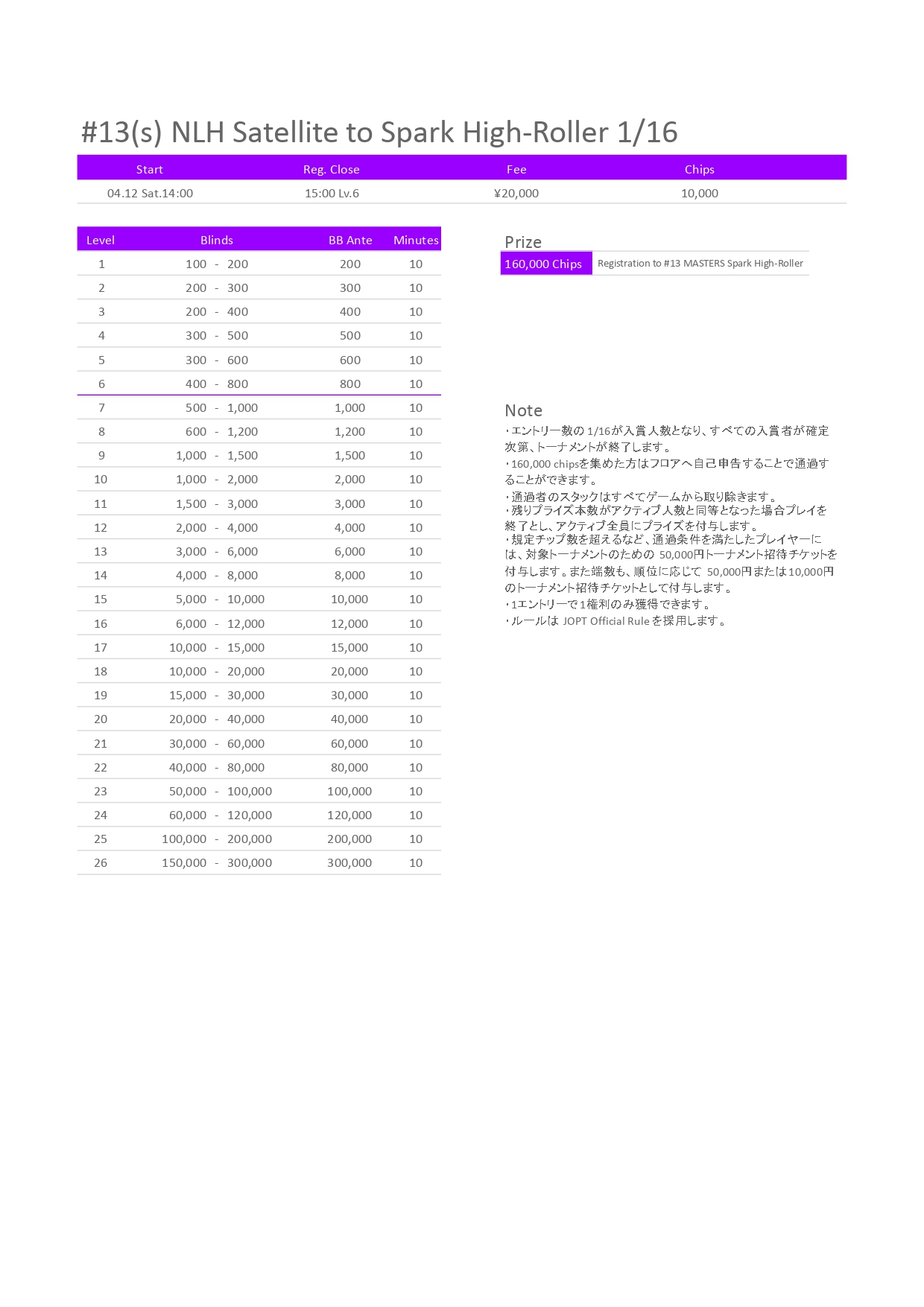 | 12/15(月) | 18:00 | 【JOPT 15Ticket】メガサテライト | Casino Live Tokyo |