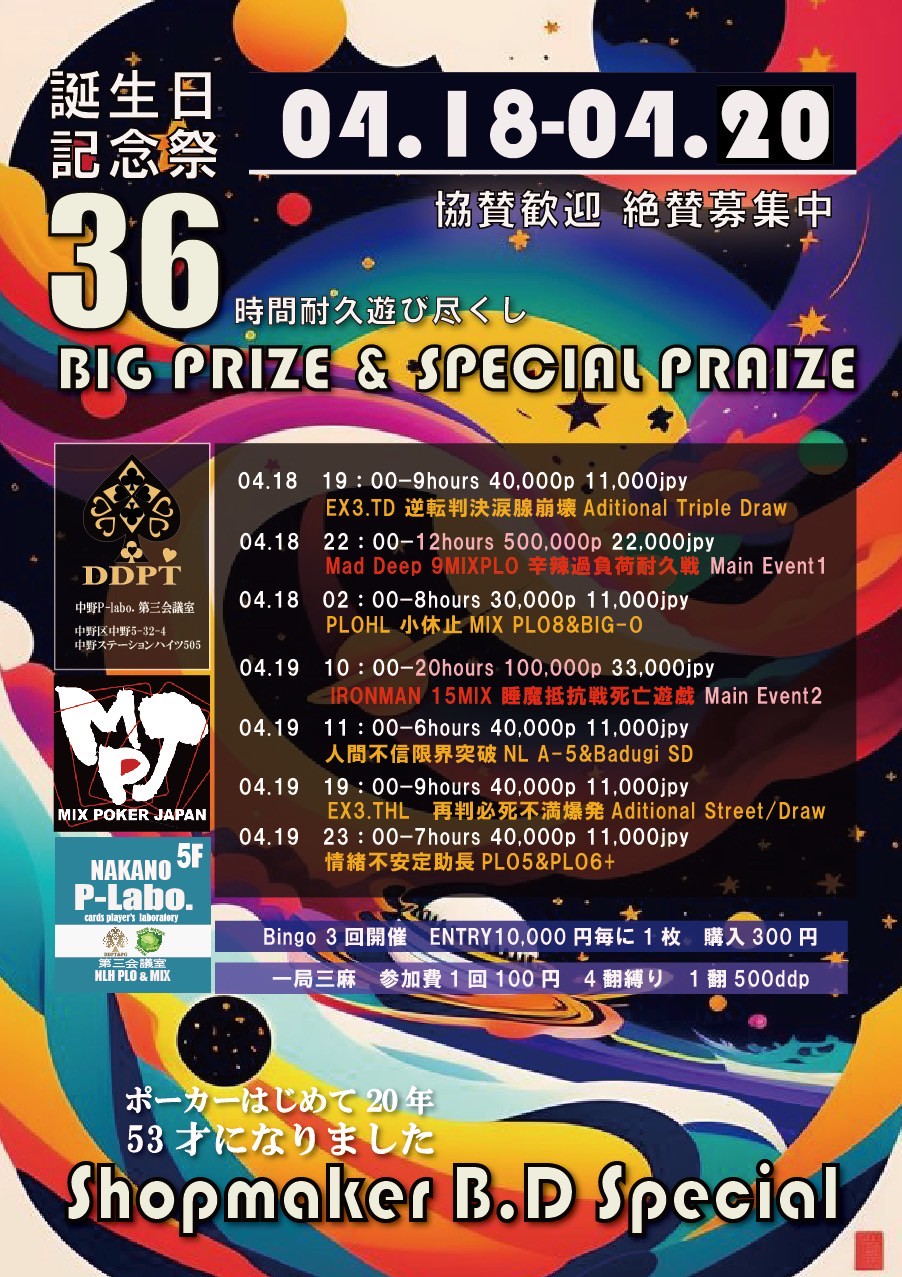 | 12/15(月) | 16:00 | 【JOPT】1000円で参加できる1卓限定 サテライト | EGP EBISU |