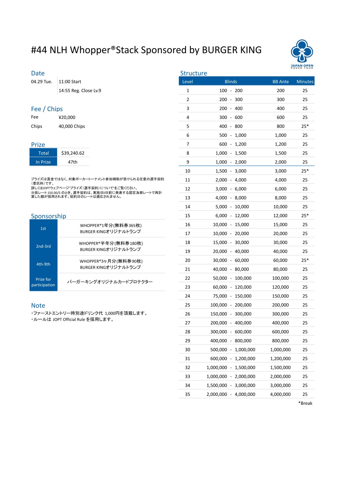 | 店舗名 | JAPAN OPEN POKER TOUR |