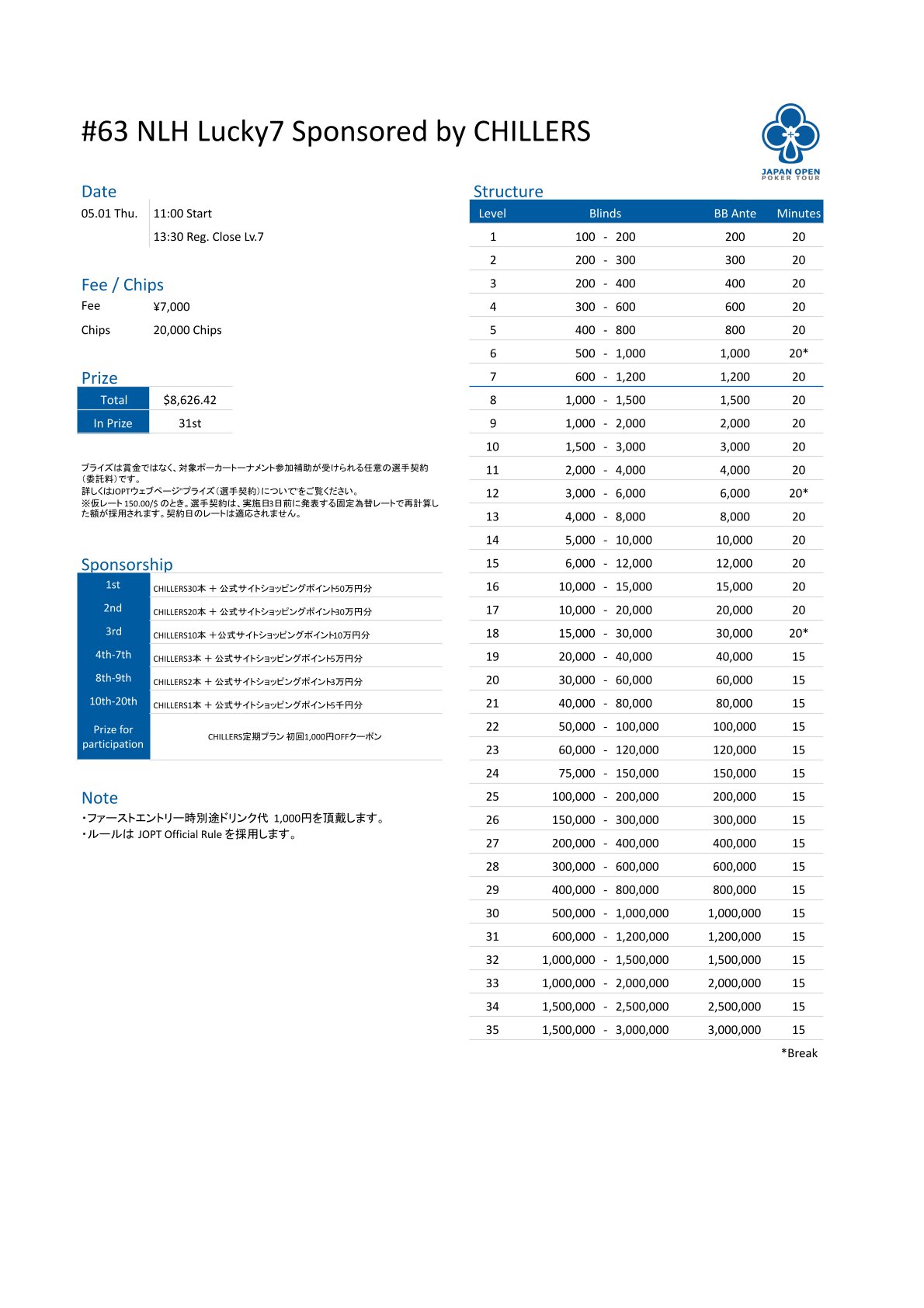 NLH Lucky7 Sponsored by CHILLERSでは優勝者にCHILLERS 30本!さらに、参加者全員に「CHILLERS定期プラン 初回1,000円OFFクーポン」をプレゼント。