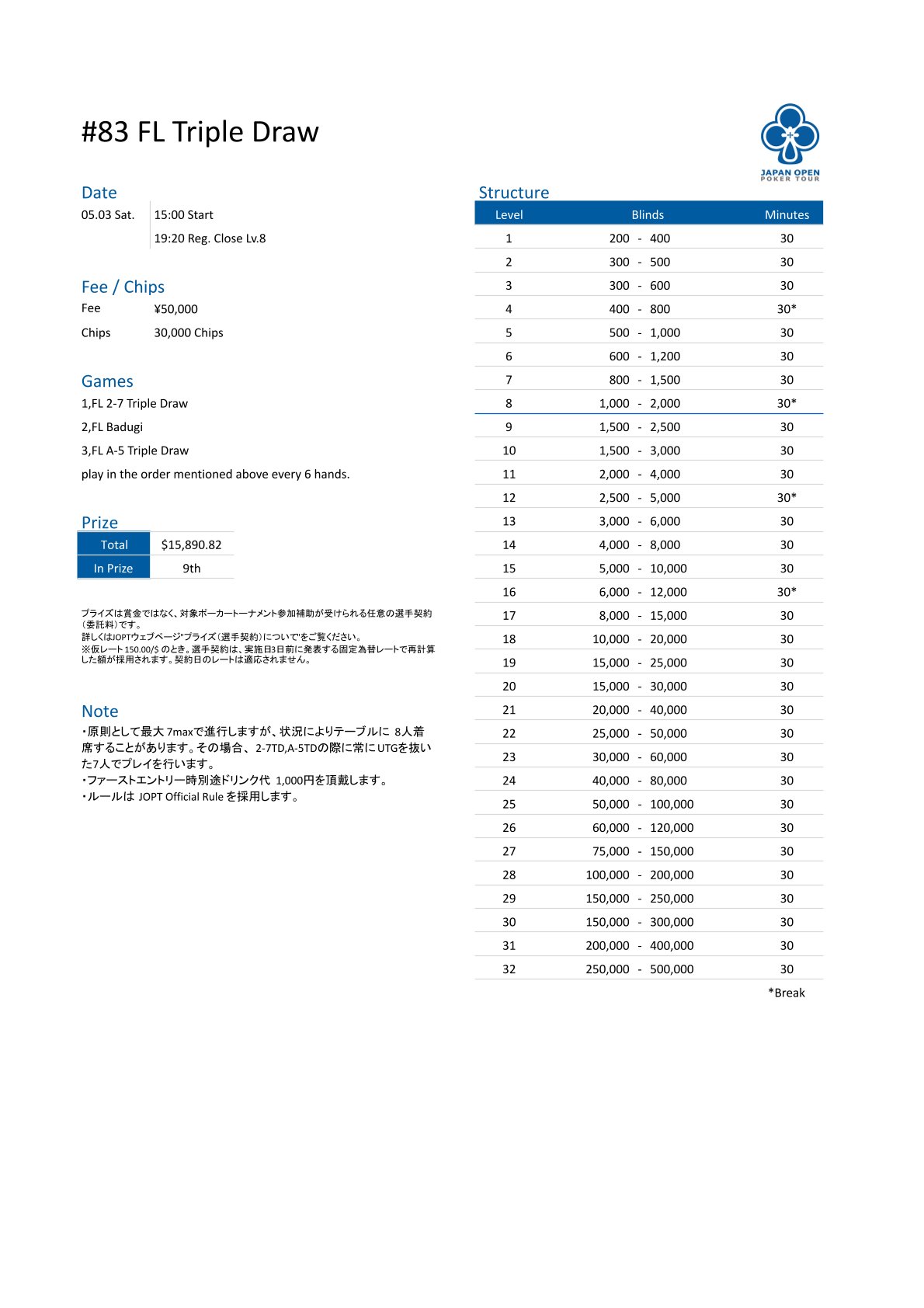 | 店舗名 | JAPAN OPEN POKER TOUR |