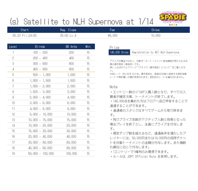 | 12/15(月) | 16:00 | 【JOPT】1000円で参加できる1卓限定 サテライト | EGP EBISU |