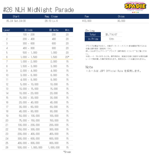 | 12/15(月) | 18:00 | 【JOPT 15Ticket】メガサテライト | Casino Live Tokyo |