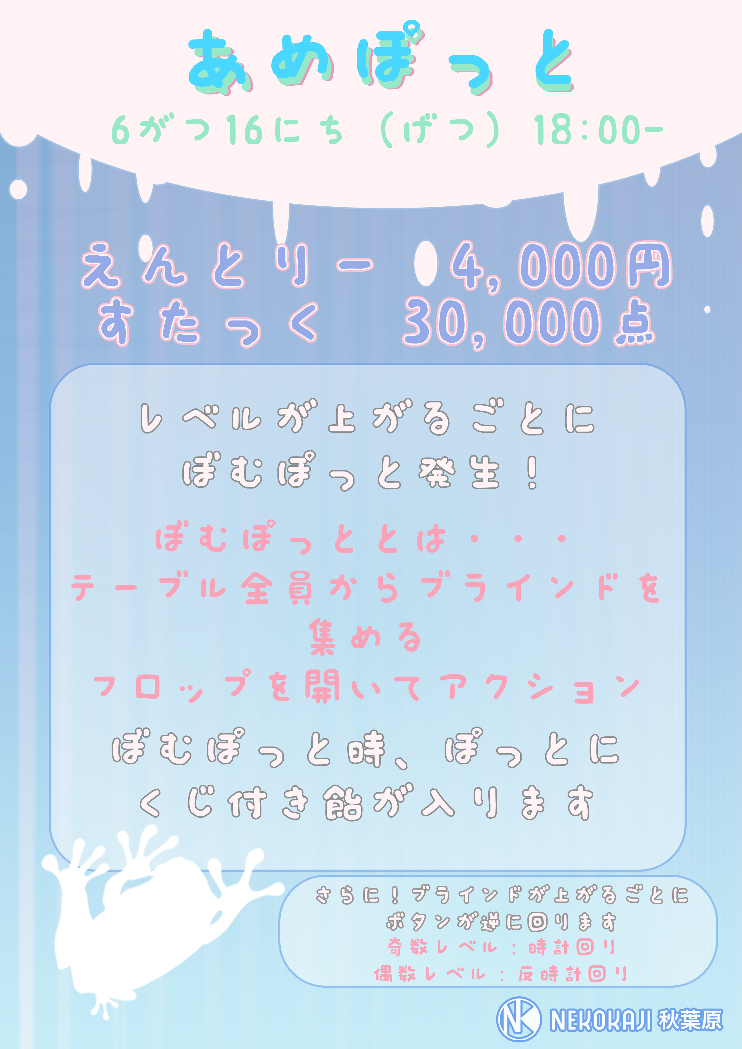 | ゲーム | 30,000点 / ノーリミット / テキサスホールデム / 20Min. / ポイントなし |