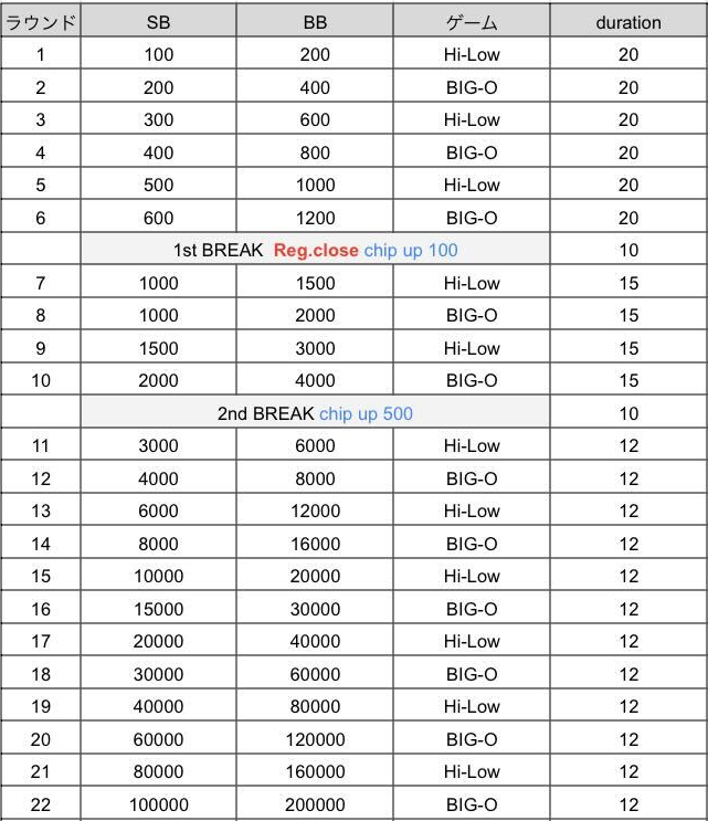 ※TD権限によりタイマースタート、ブラインド、ストラクチャーの変更となる場合がございます。