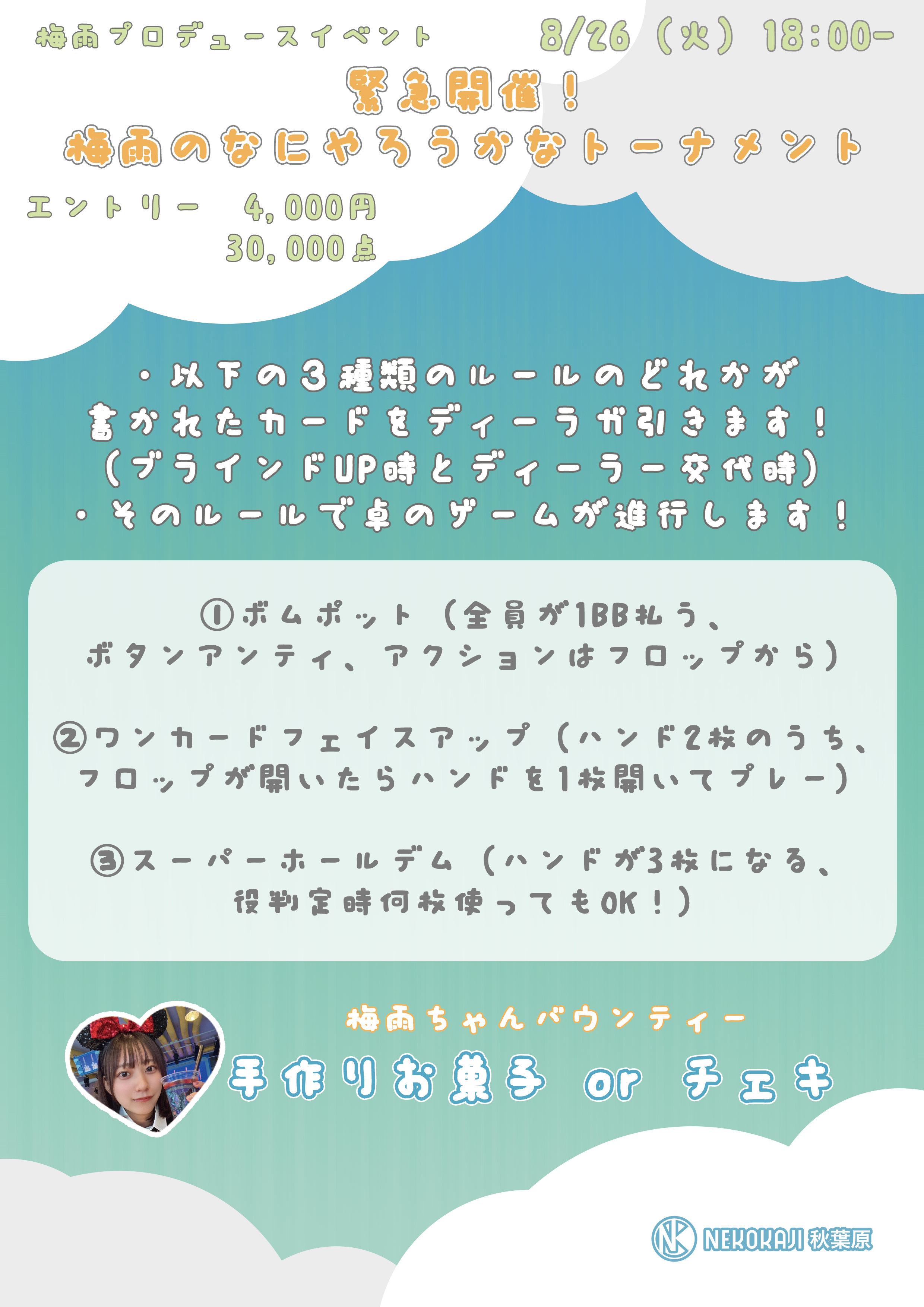 | ゲーム | 30,000点 / ノーリミット / テキサスホールデム / 20Min. / ポイントなし |