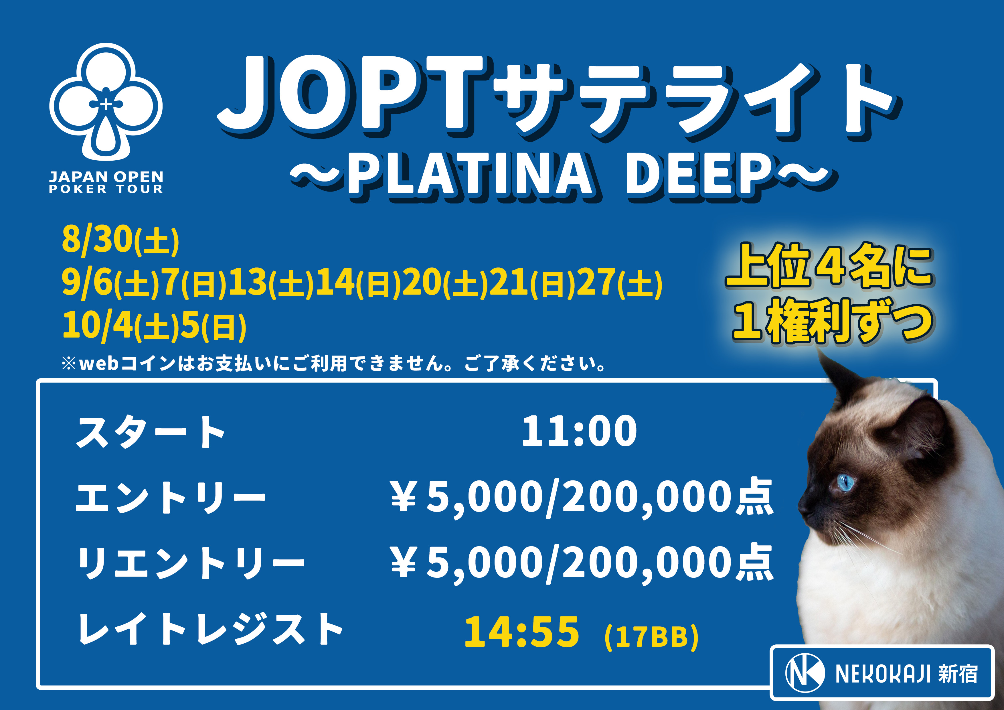 | 12/15(月) | 16:00 | 【JOPT】1000円で参加できる1卓限定 サテライト | EGP EBISU |