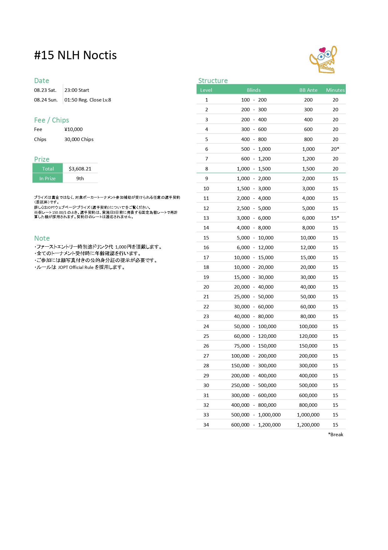 | 12/15(月) | 18:00 | 【JOPT 15Ticket】メガサテライト | Casino Live Tokyo |