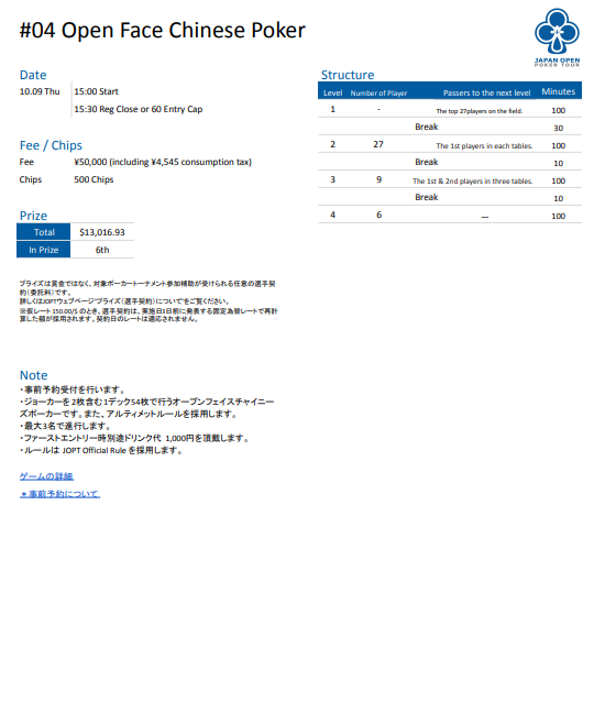 | 店舗名 | JAPAN OPEN POKER TOUR |