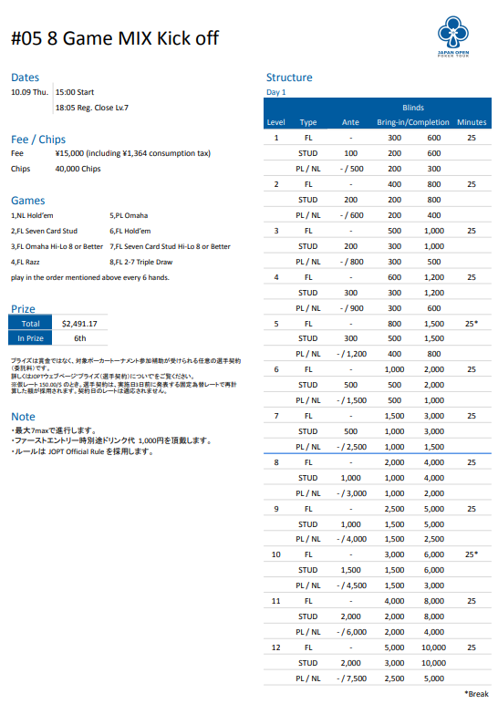 | 店舗名 | JAPAN OPEN POKER TOUR |