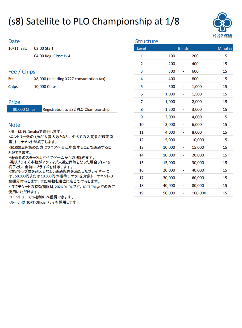 | 店舗名 | JAPAN OPEN POKER TOUR |