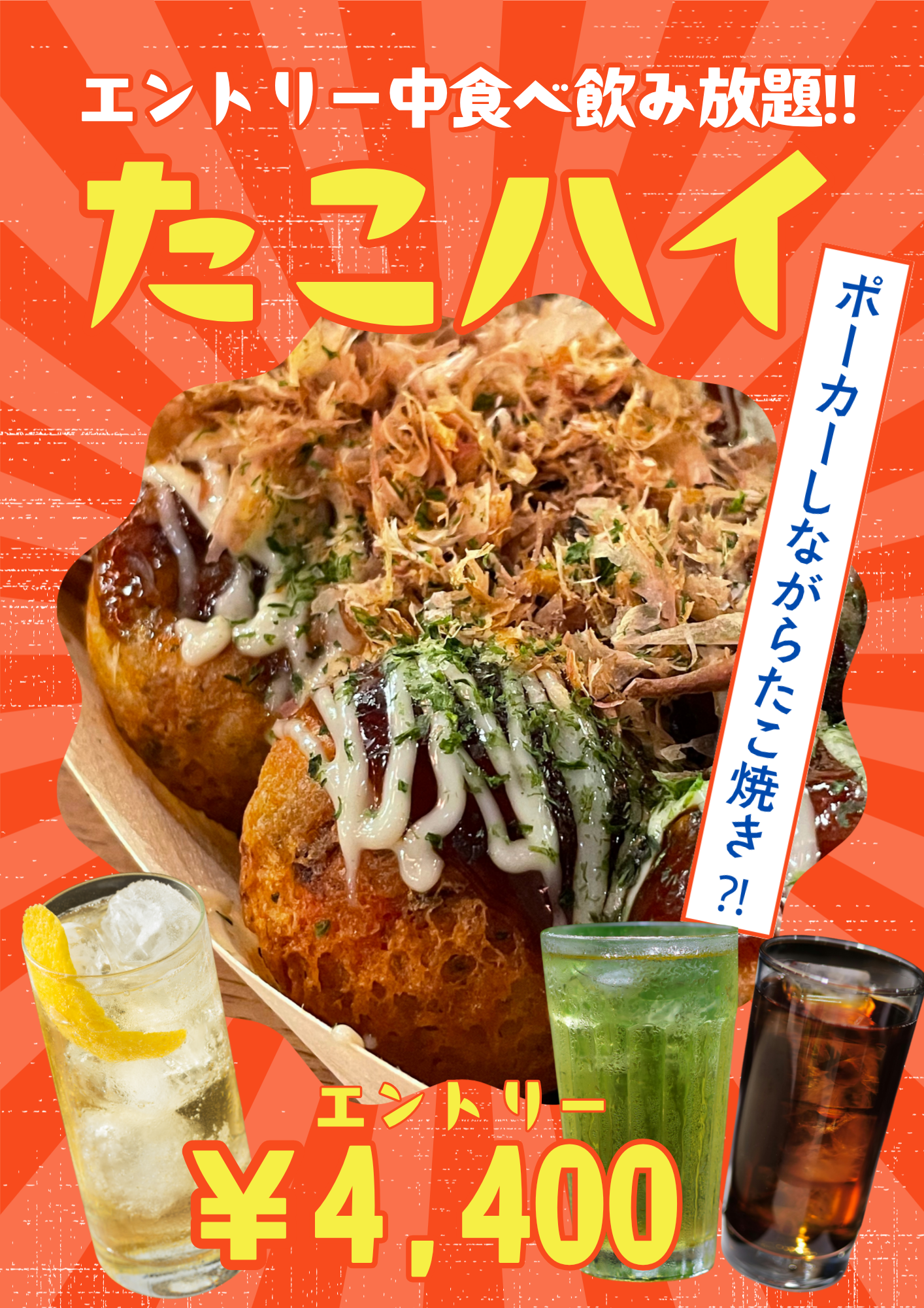 エントリー中、たこ焼きと【ハイボール/ウーロンハイ/緑茶ハイ/烏龍茶/緑茶】が食べ飲み放題イベントです!!