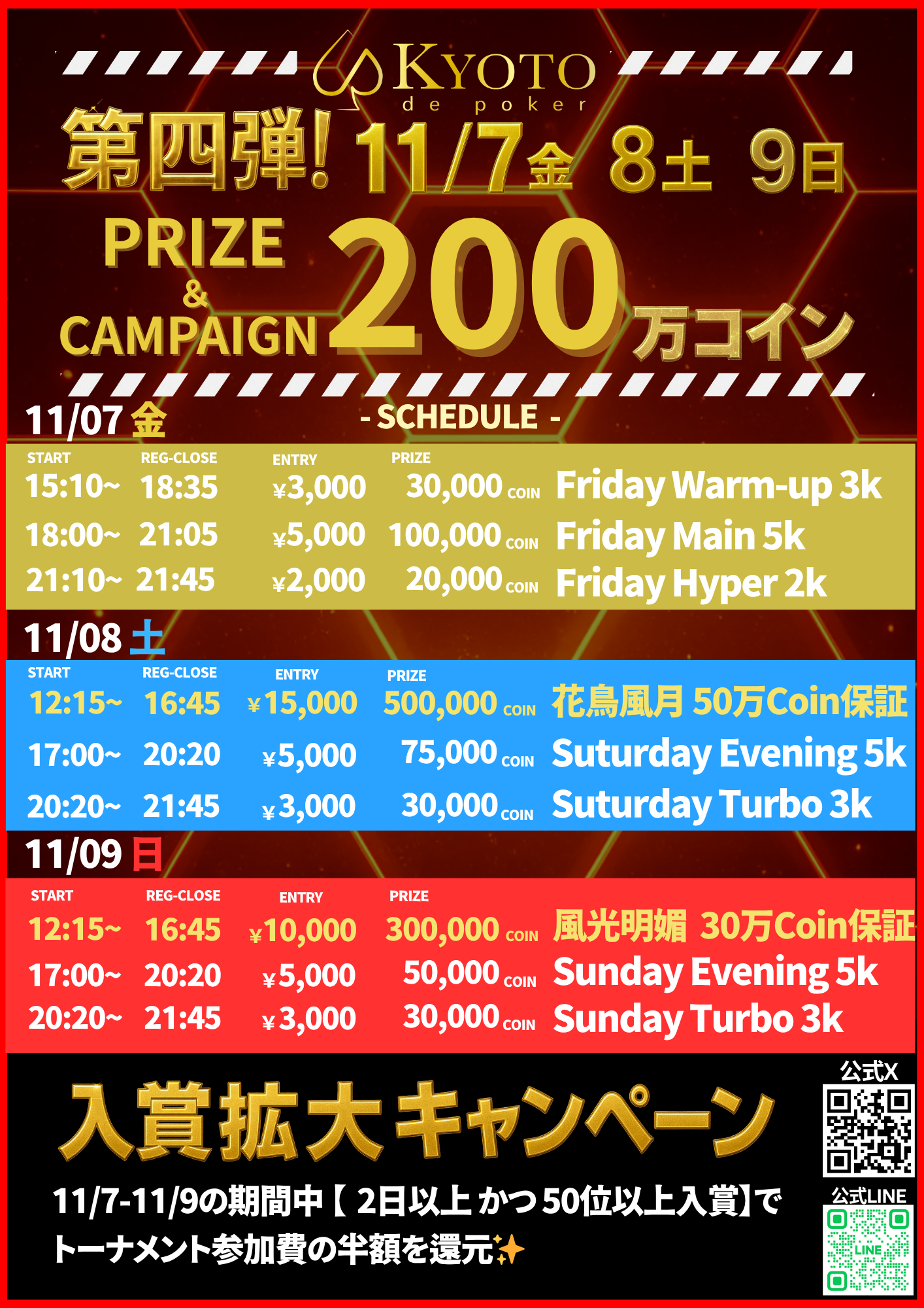 11/7-11/9期間中、2日以上のトーナメント出場&それぞれ50位以上入賞でトーナメント参加費の半額分を入賞扱いとします‼