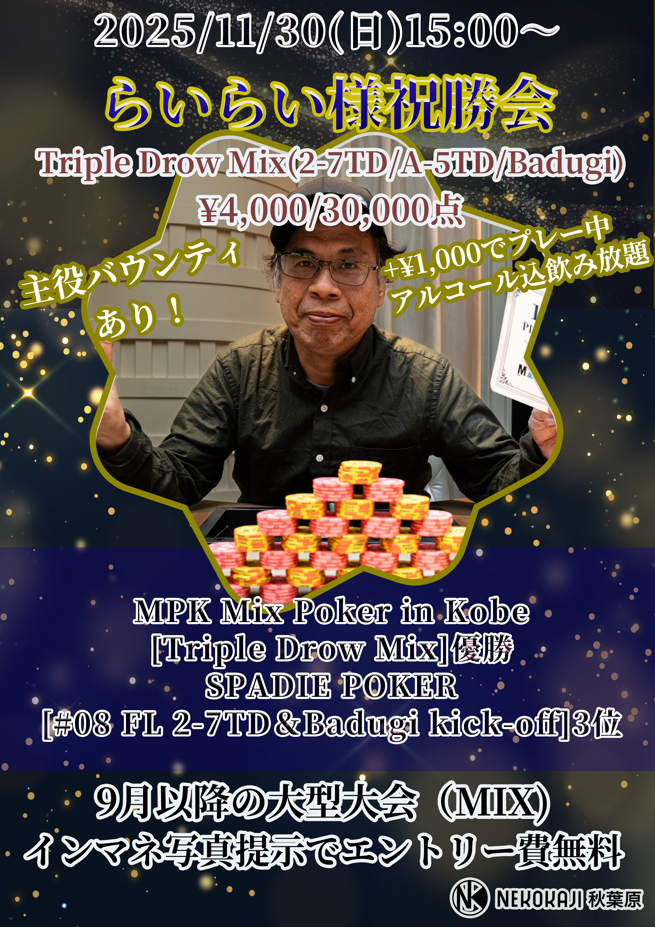 | 12/16(火) | 15:30 | 【♠︎SPADIE】Daily NLH 2K | 秋葉原カジノクエスト |
