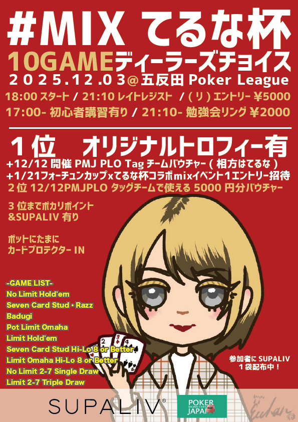 | 12/15(月) | 16:00 | 【JOPT】1000円で参加できる1卓限定 サテライト | EGP EBISU |
